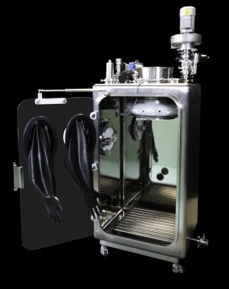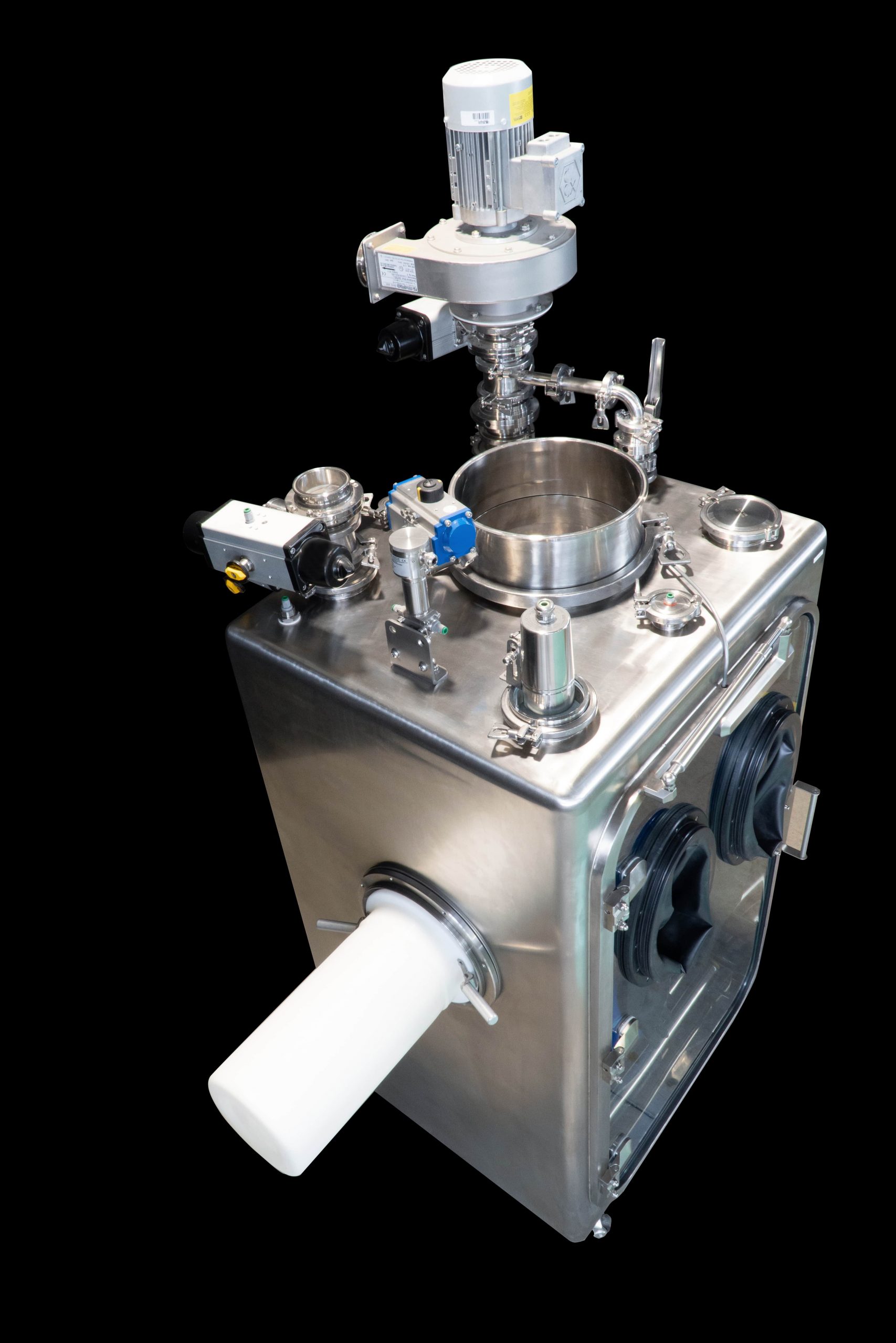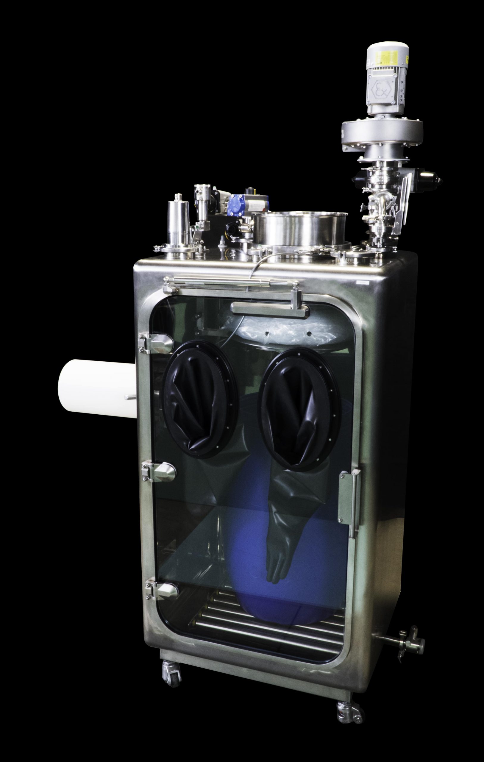 The skid is provided with a cleaning spray ball and provisions for water drainage. Furthermore, the glove box is equipped to assure inerting cycles designed to further implement the quality and safety of operations.