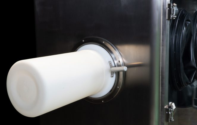 In CSV Containment, we designed this small-sized skid to allow discharging from a mill into drums via continuous liner, thus ensuring a second level of OEB5-classified containment. Operators, thanks to the gloves on the large glass door, can discharge and bring samples outside through a side-mounted RTP port.