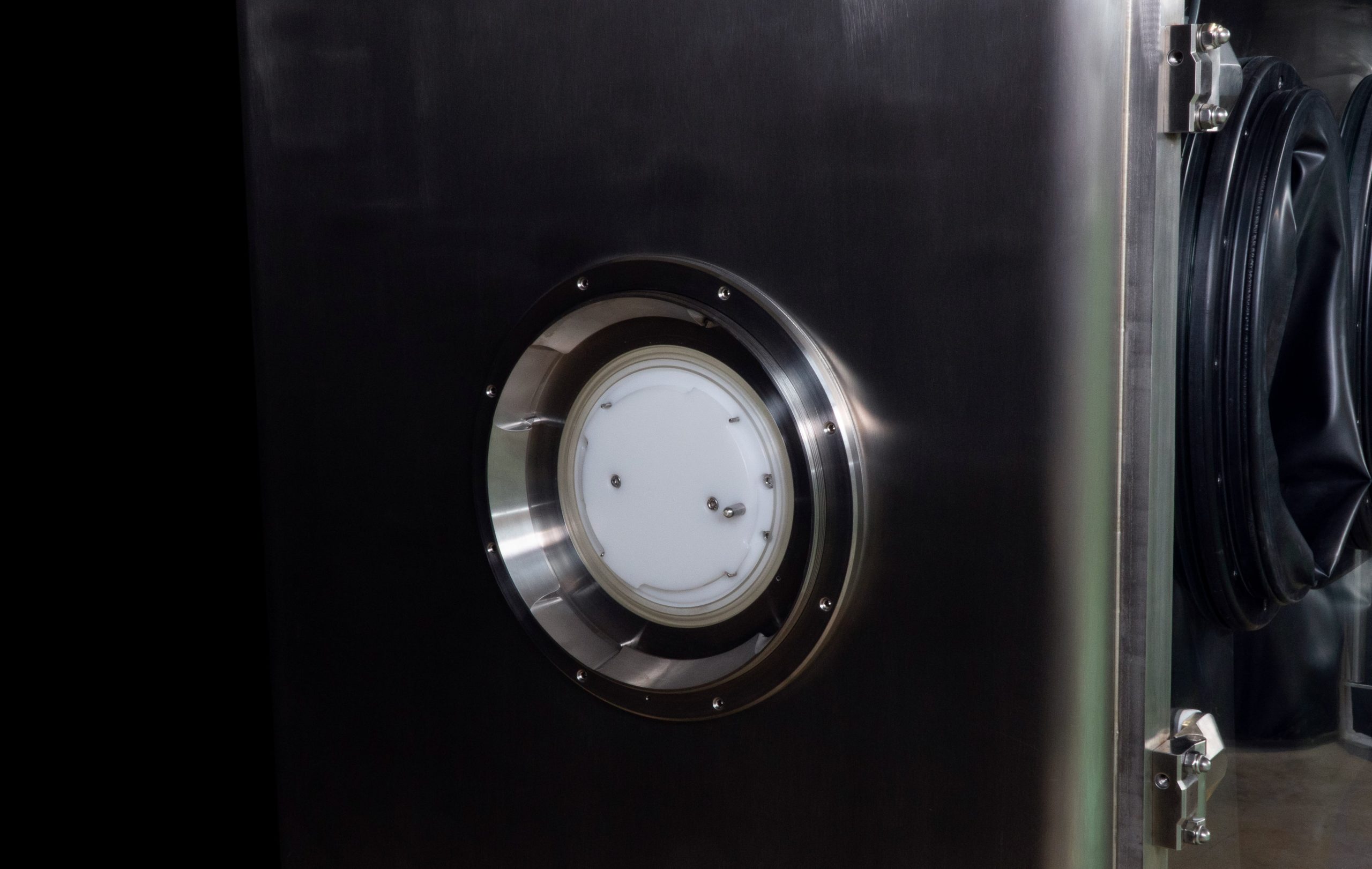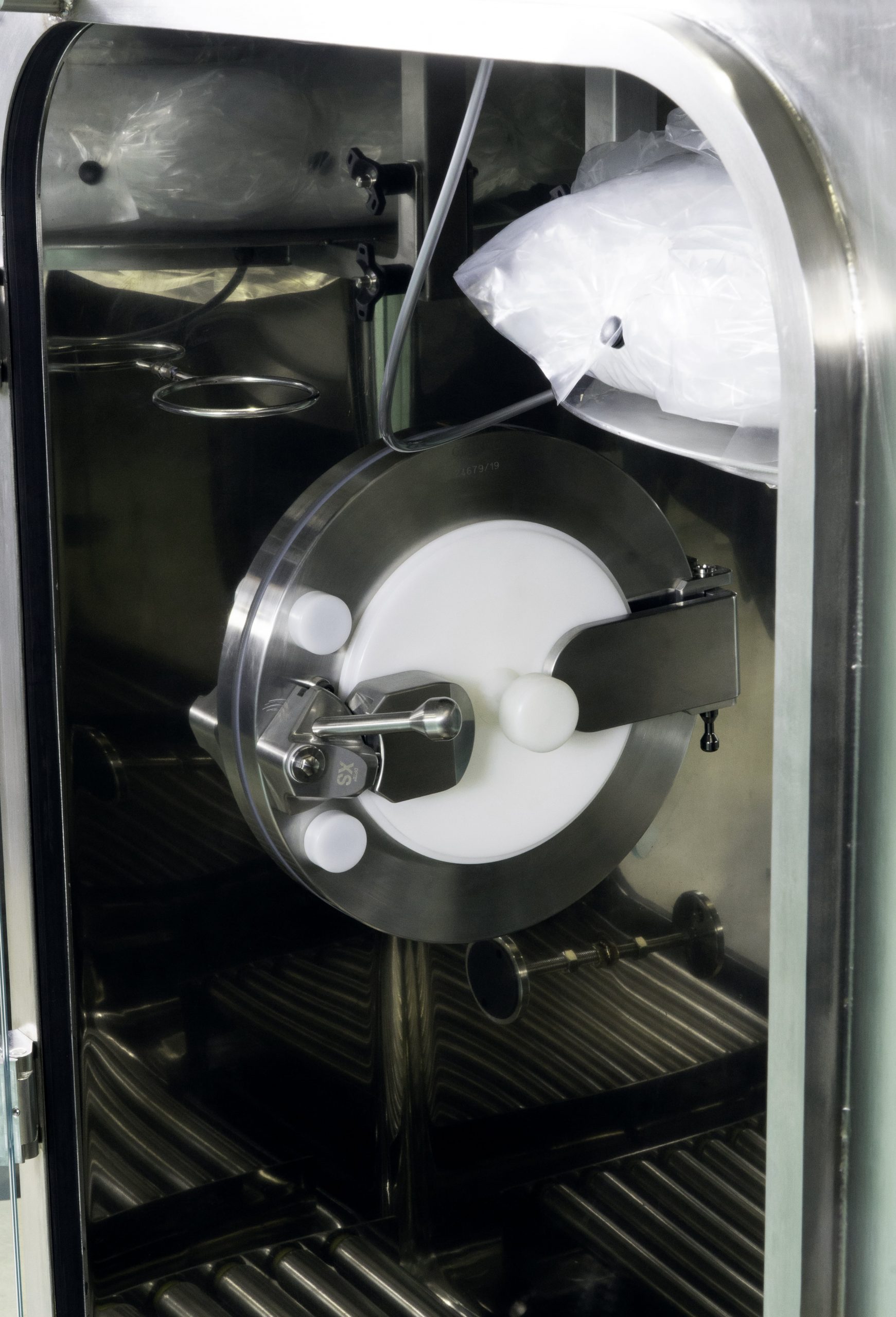 At the heart of a glove box, there is always a point of interest: safety. We have designed this glove box to offer both comfort and protection. We have planned everything to work most effectively around the discharge point. A roller conveyor facilitates drum insertion and extraction operations. Moreover, there are dedicated spaces to accommodate closing tools and bag clamps. In addition, the comfortable RTP door allows the material to exit safely from the beta container. Finally, the inflatable seal ring mounted on the canister in the glove box serves both to secure the liner, allowing its control with gradual unwinding, and to function as an anti-dust collar, thanks to the internal inflatable gasket.