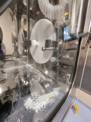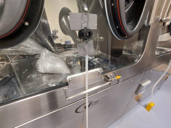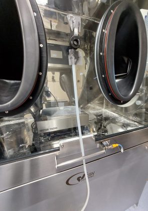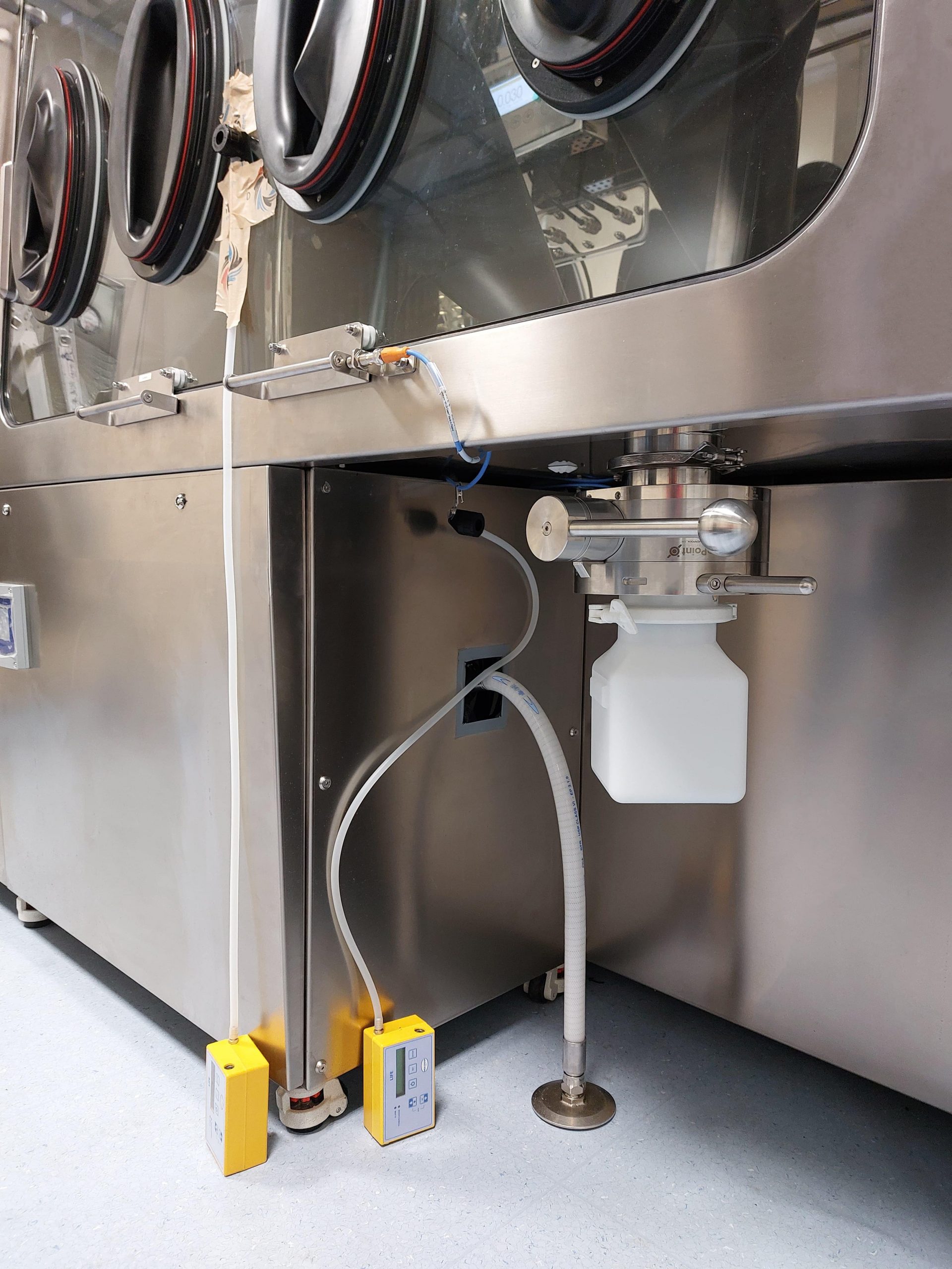 The main chambers are equipped with temperature and humidity sensors. In all chambers, the oxygen sensor reads the values during inertisation. Working in an inert atmosphere, hence with nitrogen, can increase risks for operators. To assess the residual nitrogen quantity before reopening the chambers, air is introduced and measured inside the isolators until an optimal oxygen level is reached. This prevents operators from accidentally inhaling harmful mixtures. Another concern is dust and its monitoring. The integrity of the glove boxes is measured by leak tests that can be initiated from the machine’s control panel. CSV Containment also performs SMEPAC Tests with its containment experts. Production operations are replicated using a dummy, and any airborne particles are measured. After collecting samples with the swab phase, all data is quickly processed by partner workers.