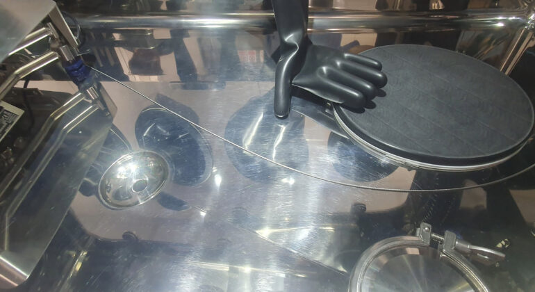 The decision to implement a double-sided glove box stems from the need to operate in the center of a room, enabling maximum freedom of movement. Custom-designed according to client specifications, this rigid isolator is truly versatile. Its most striking feature is the natural light that flows through both chambers, paired with the presence of 12 glove ports, allowing operators to reach every corner of the internal workspace with ease.