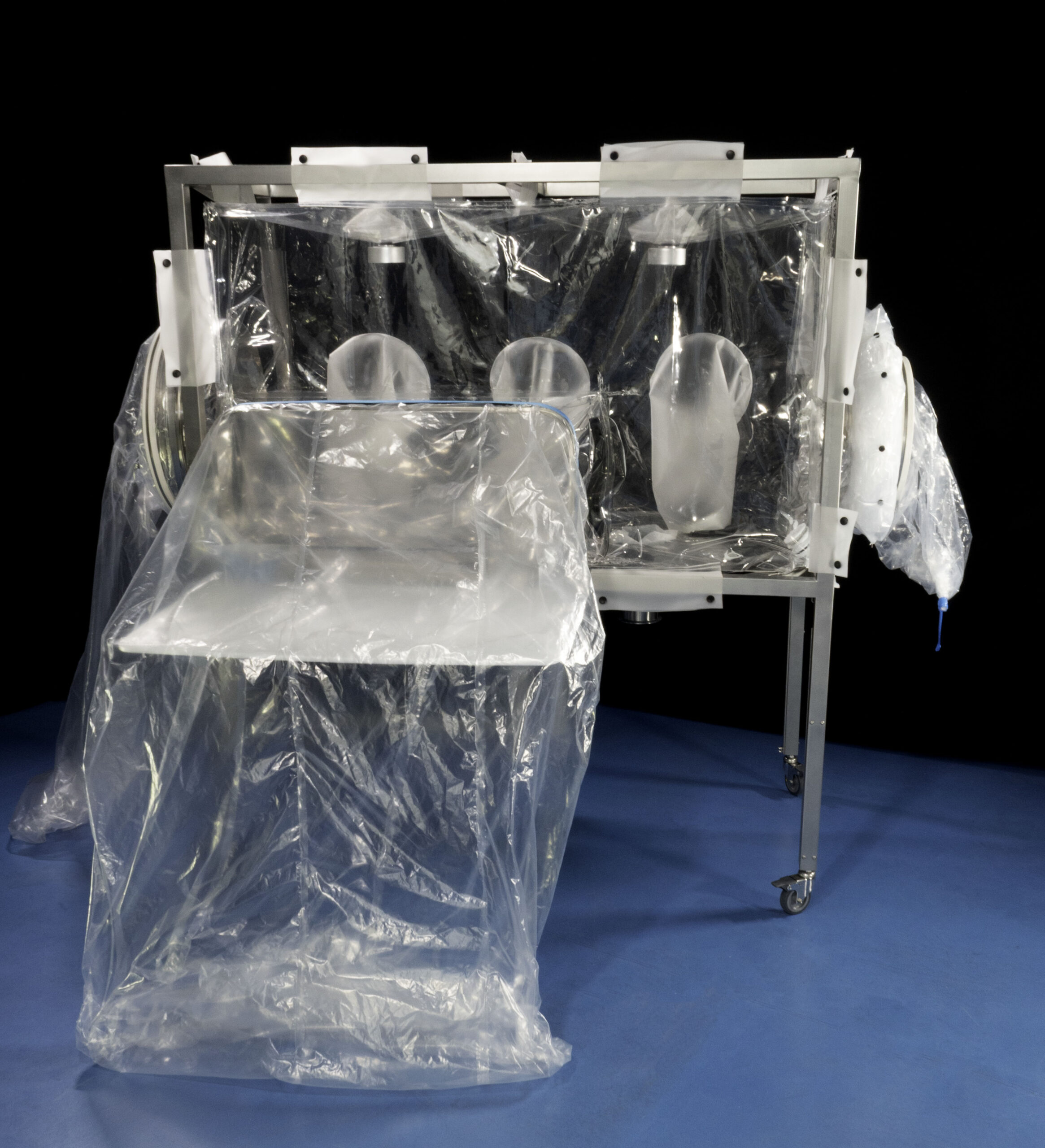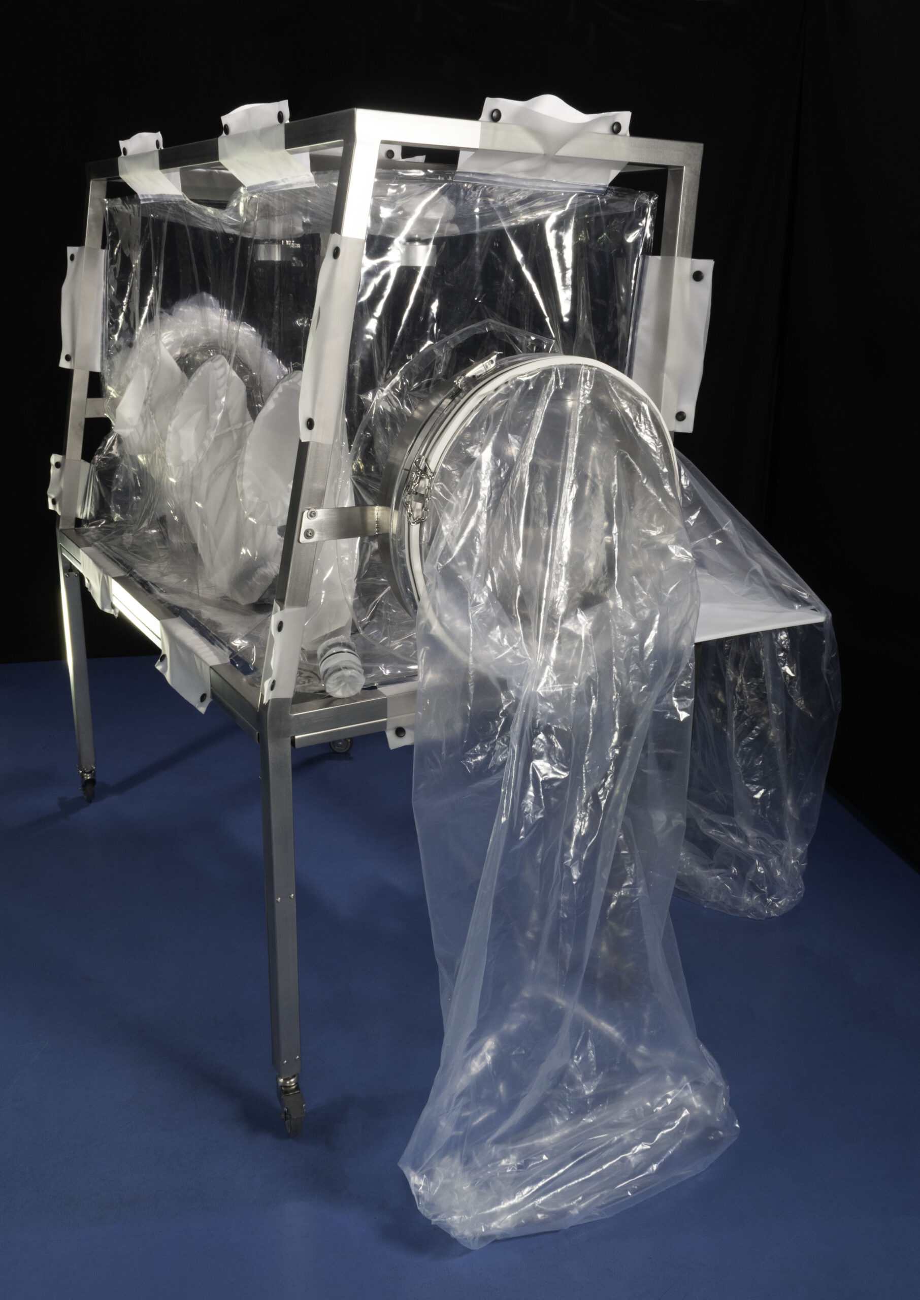Of course, flexible isolators can be equipped with CPC connectors to bring water inside and fitted with mini spray guns or vaporisers to facilitate chamber cleaning.
