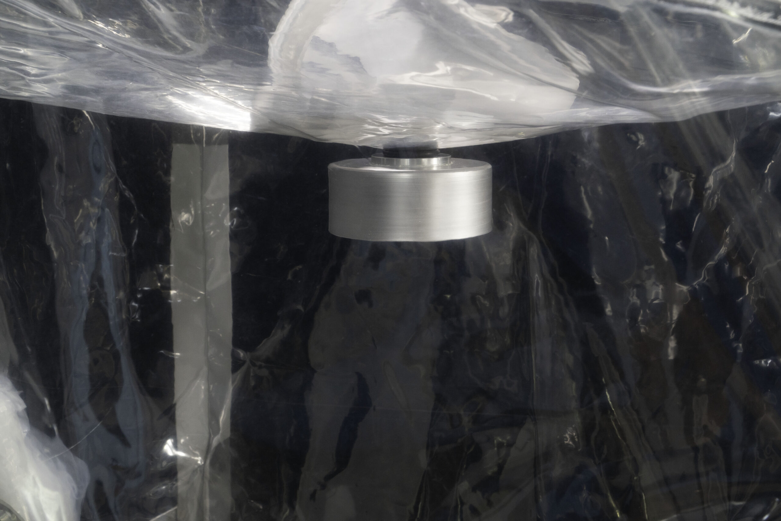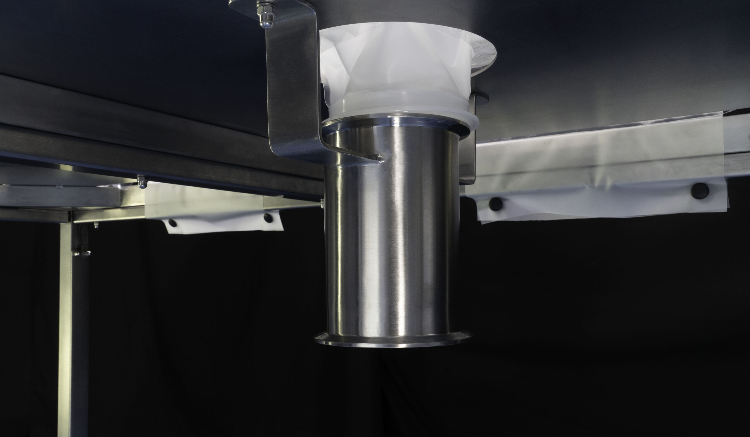 Work in the glove box does not begin and end inside the chamber but is part of a process. In addition to the BIBO lines present, being able to connect to a valve is essential. For this reason, the isolator frame is equipped with a clamp connection to interface with containment valves, for example. The valves allow dust or liquids (such as drainage for the washing phase, for example) to be discharged into bags or bottles.